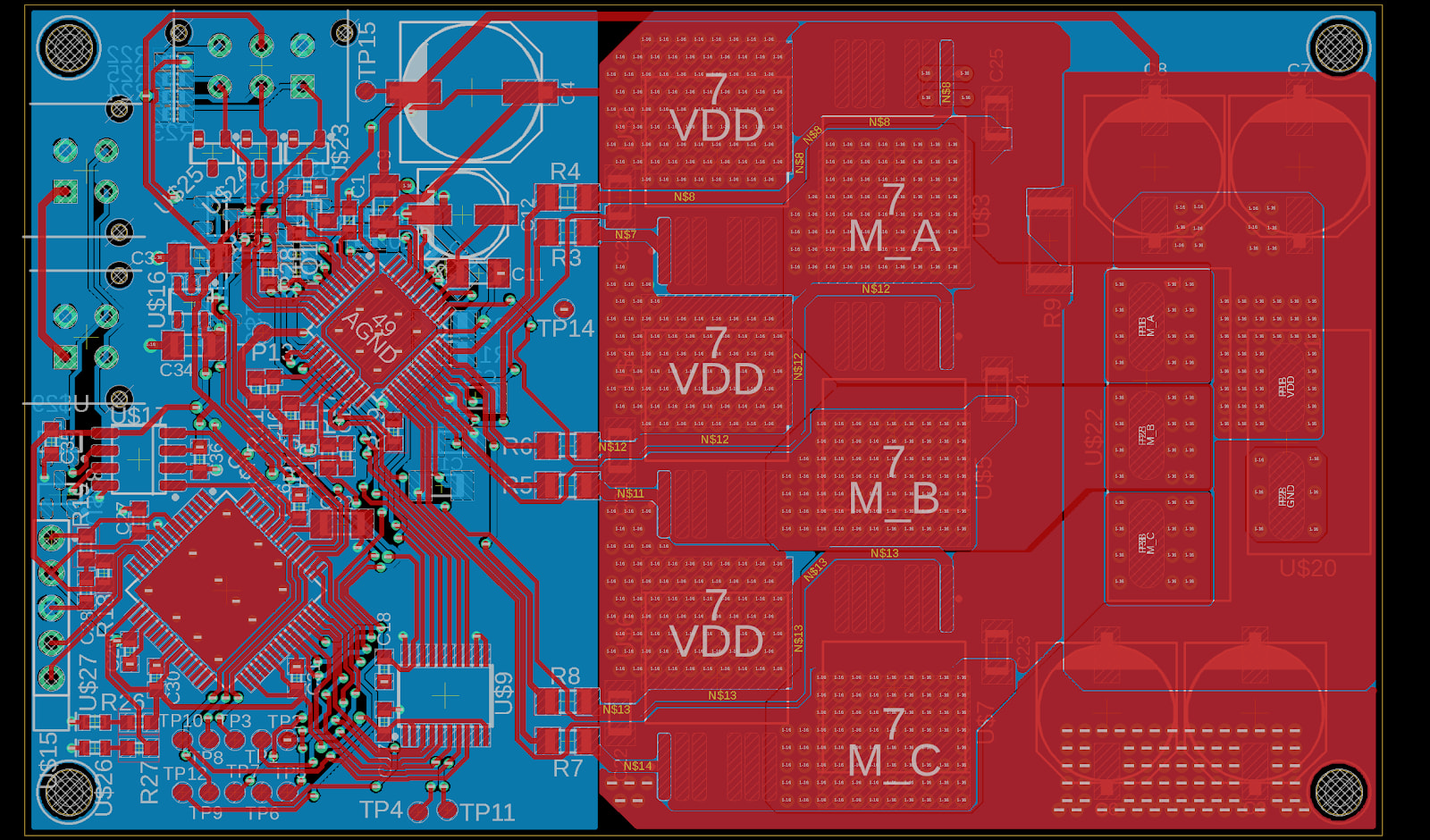 The electrical sub-team on Mars Rover develops the hardware to run all systems on the rover. We manage communication between the basestation and the rover, handle low level control of motors and sensors, and manage power on the rover. This year we're developing brushless motor drivers and also working on general improvements to the system across the board. Since many mechanical components on the rover are not finalized until later in the year, we are responsible for designing flexible and robust hardware that can be adapted to changing designs.