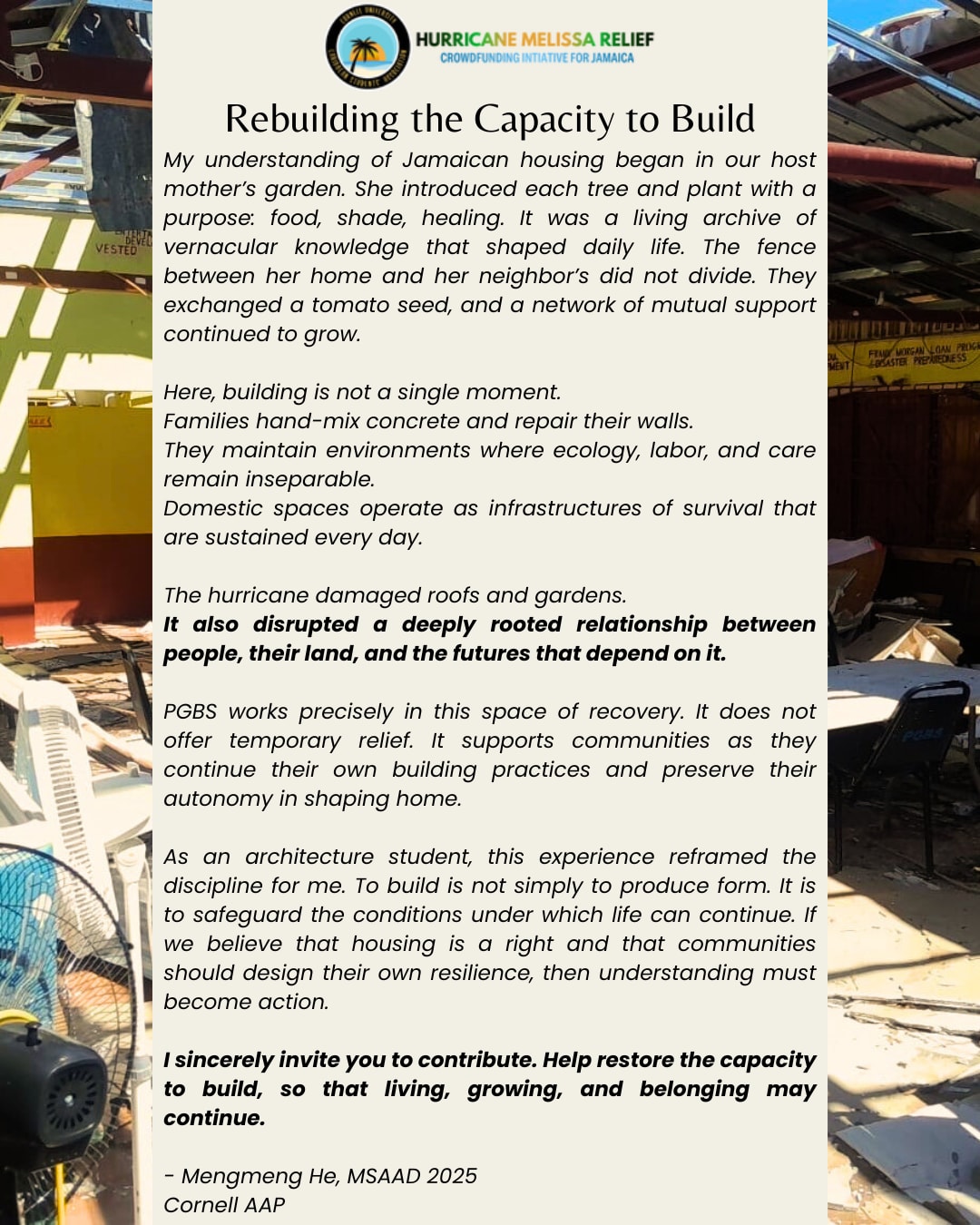 Your donation, no matter the size, will help restore safety, dignity, and hope to victims of Hurricane Melissa. Please consider giving and sharing this effort with those you know.